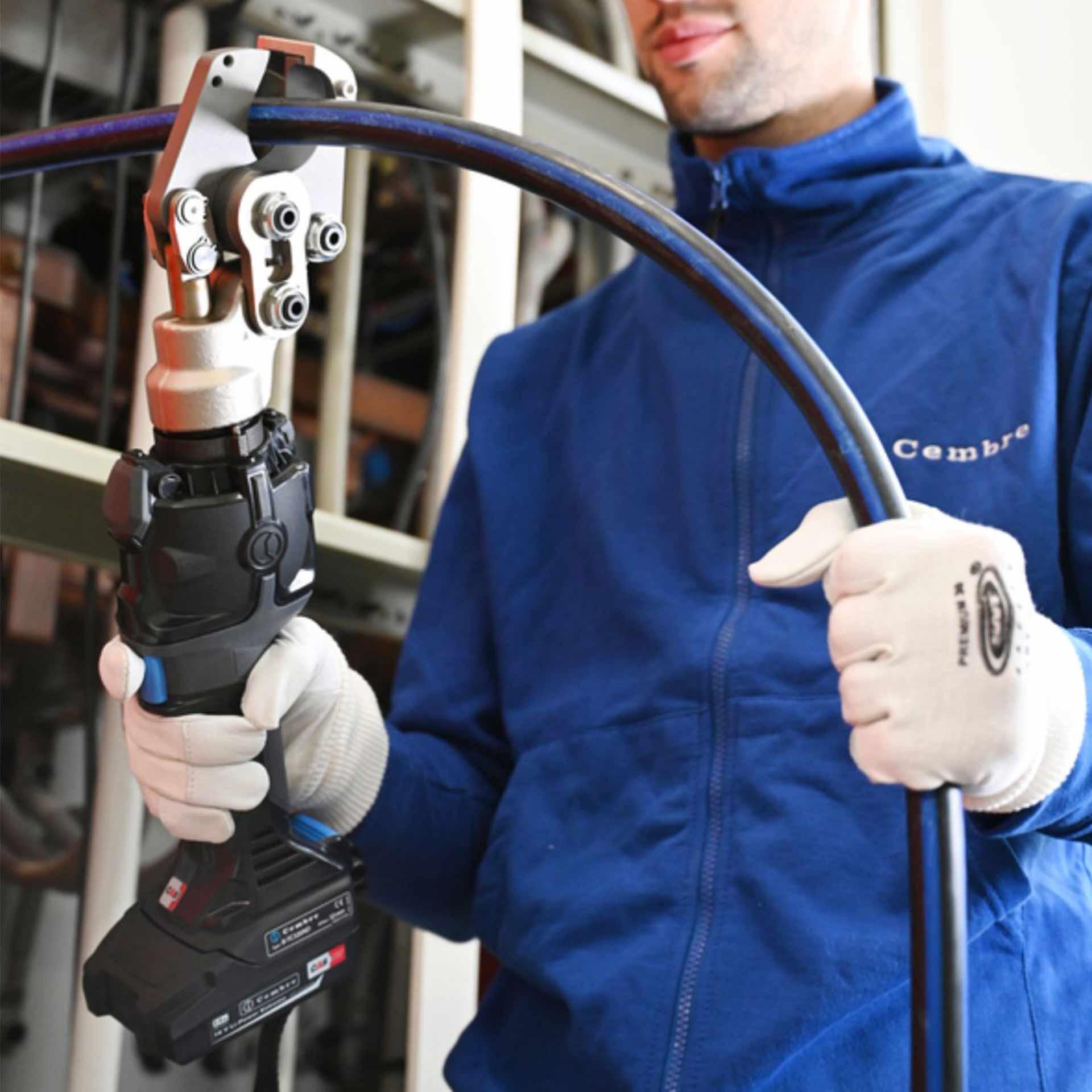 Der B-TC320NDF gehört zur neuen Generation von tragbaren Akkuwerkzeugen, gekennzeichnet durch eine “Bi-linear” Bauform. Das hydraulische Akkuschneidwerkzeug B-TC320NDF mit Doppelkolbenhydraulik, ist speziell entwickelt worden zum Schneiden von Kupfer-, Aluminium und Telefonkabeln bis zu einem max. Durchmesser von 32 mm. Die Schneidmesser sind aus einem hochwertigen Material hergestellt, das eine hohe Standzeit gewährleistet. Der offene Kopf, erleichtert das Arbeiten an schwer zugänglichen Orten. Das Handling ist durch den um 180° drehbaren Kopf sehr gut gewährleistet. Der hydraulische Akkuschneider ist mit einem Überdruckventil ausgestattet, das eine Überlastung verhindert. Ein Druckentlastungsknopf, gewährleistet zu jedem Zeitpunkt die leichte Handhabung des Werkzeuges. Der Akku ist mit einer LED-Anzeige ausgestattet. Durch die Betätigung der Taste am Akku, wird die verbleibende Akkulaufzeit angezeigt. Die Geräusche und Vibrationen sind während der Arbeit sehr gering. Umgebungstemperatur: -15 bis +50 ° C.