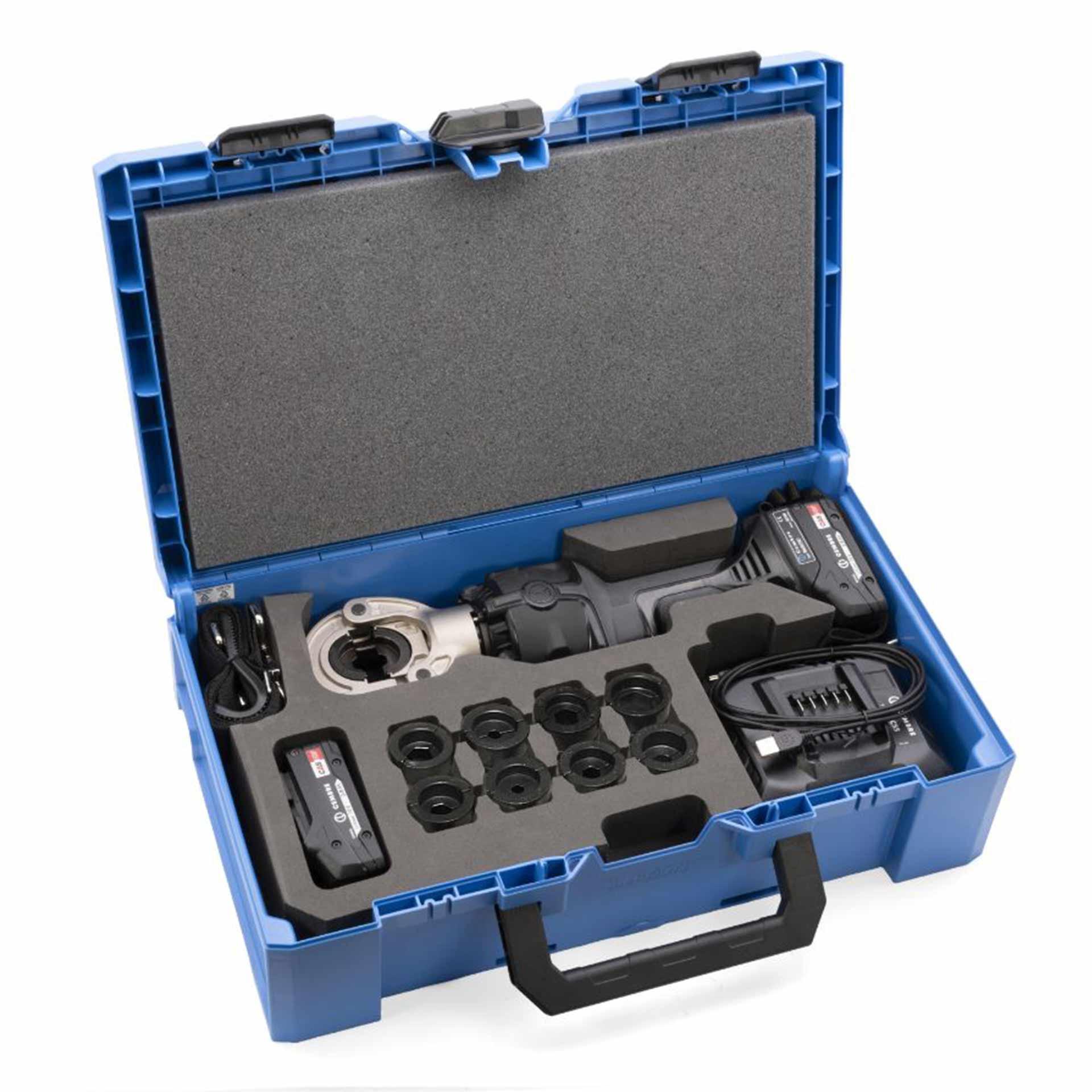 B600CND werkzeug; MH25-60C presseinsatz; MH35-60C presseinsatz; MH50-60C presseinsatz; MH70-60C presseinsatz; MH95-60C presseinsatz; MH120-60C presseinsatz; MH150-60C presseinsatz; MH185-60C presseinsatz; MH240-60C presseinsatz; Ladegreät; 2x 18V Metabo Akku; USB-Kabel; Traggurt; Koffer; Bedinungsanleitung;
