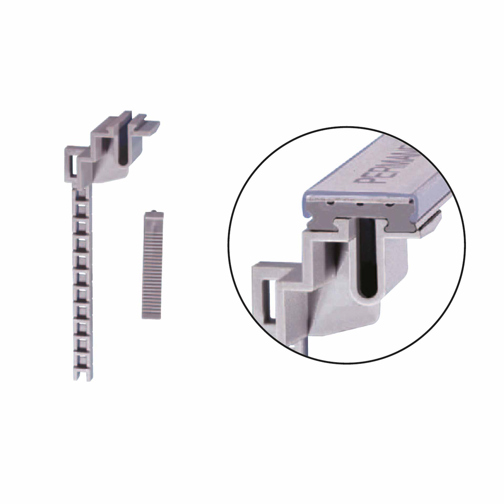Clips de retenu GX : - empêchent que les câbles sortent de la goulotte, que celle-ci soit monté horizontalement ou verticalement. - assurent un meilleur maintien du couverle à travers une stabilisation accrue des lamelles. - se coincent simplement entre deux lamelles.