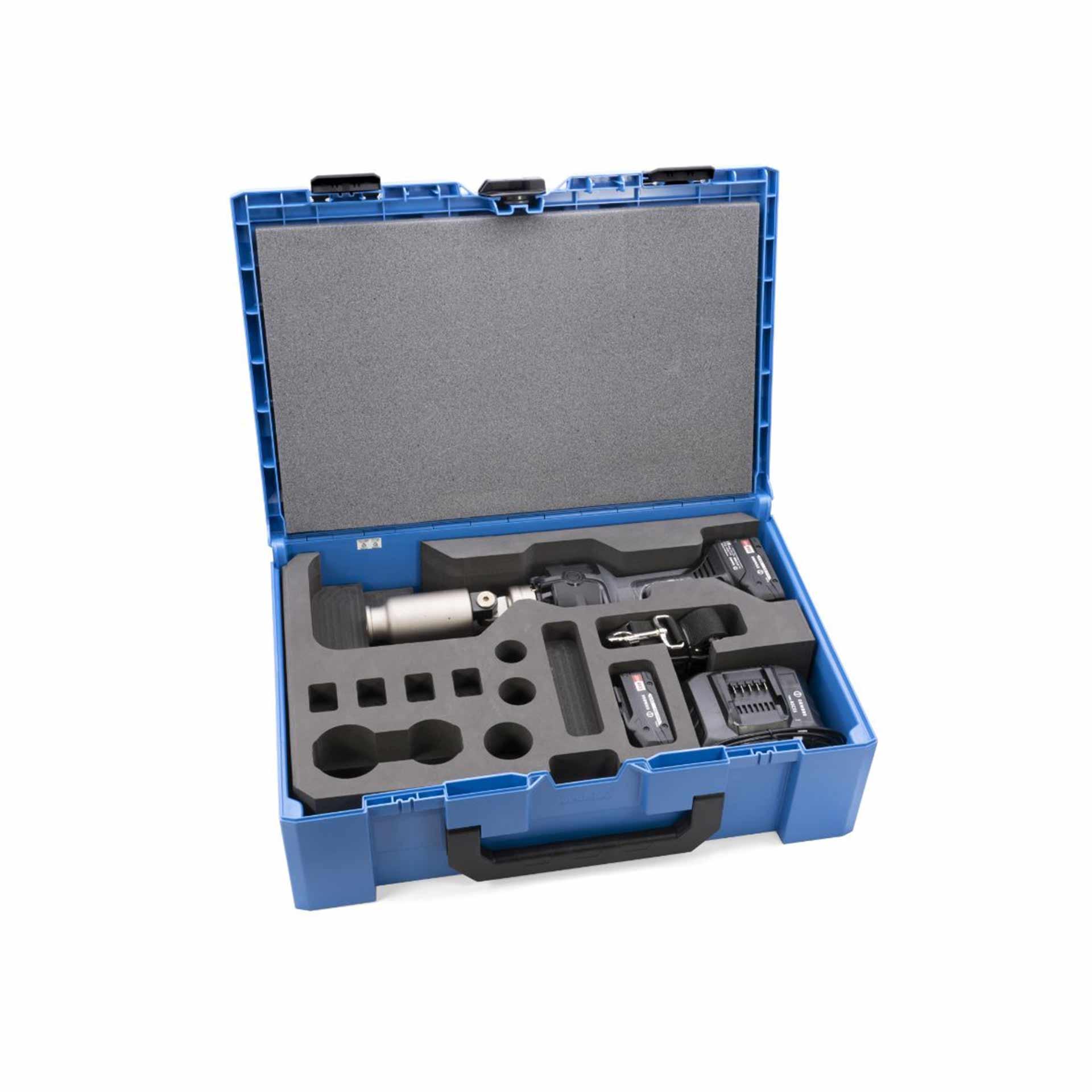Le B-FL750ND fait partie de la nouvelle génération d'outils portables à batterie, caractérisée par une conception "bi-linéaire". Il s'agit d'un outil hydraulique à batterie avec double piston hydraulique, conçu pour percer de l'acier inoxydable, de l'acier, et des plastiques renforcés de fibres de verre, jusqu'à une épaisseur maximale de 3,5 mm. Le niveau de bruit et de vibrations est très faible pendant le processus de perçage. Au début du processus, l'outil génère une forte puissance et passe automatiquement à une course de travail plus lente une fois le perçage entamé. La tête de perçage est rotative à 360° et inclinable à 180°. La batterie est équipée d'un indicateur LED qui affiche le temps de fonctionnement restant lorsque l'on appuie sur le bouton de la batterie. Le boîtier est ergonomiquement conçu pour permettre une utilisation optimale.