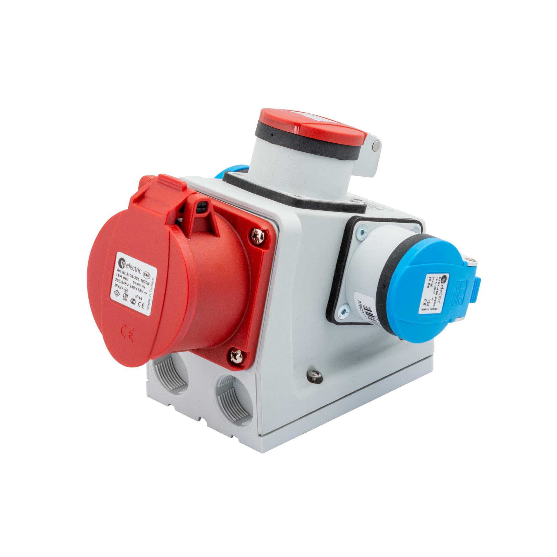 Informations sur les produits "Prise AP CEE 16A 5P 6h (IP44), 3PNE 400/230V avec T25 et 2x T23 (IP55), contacts nickelés"