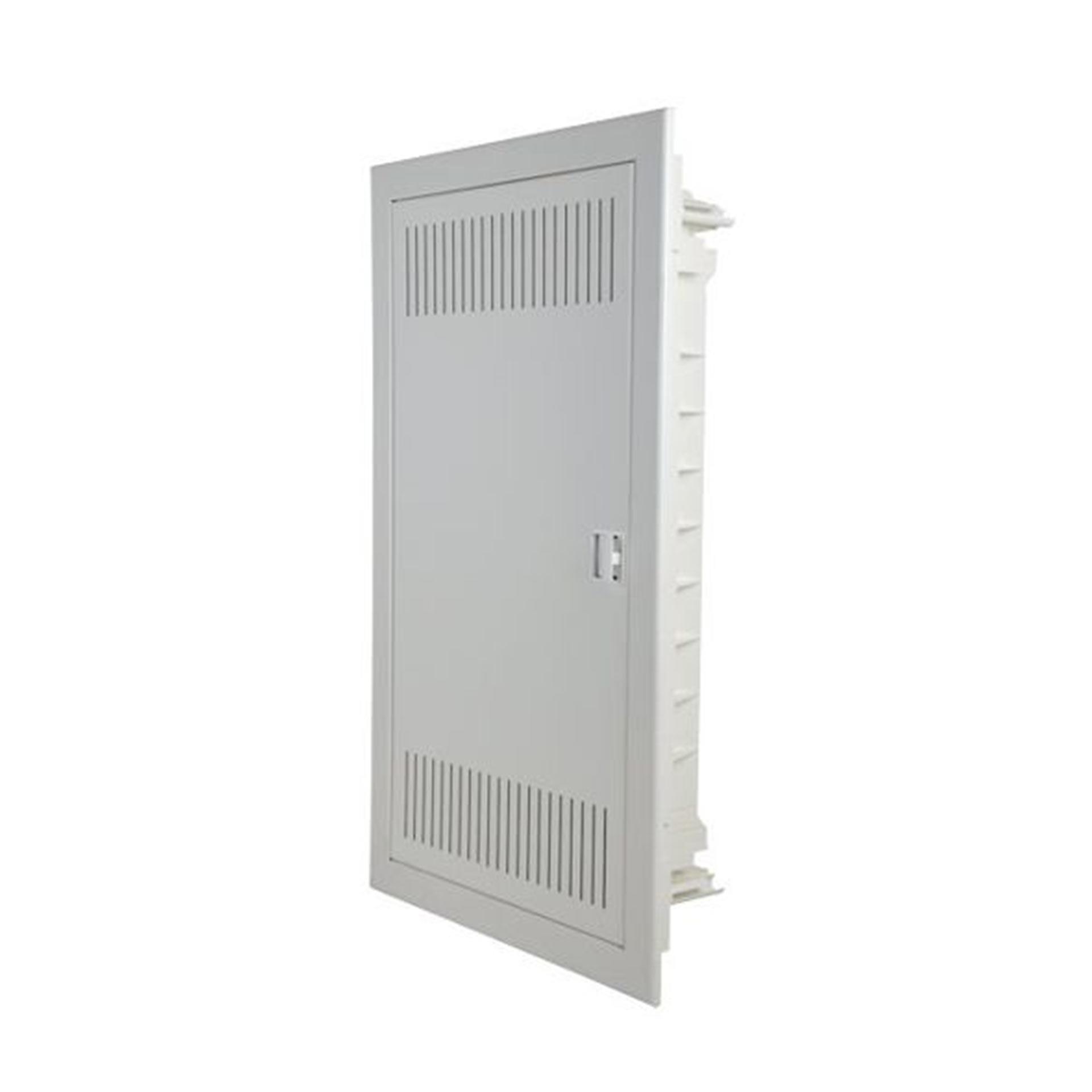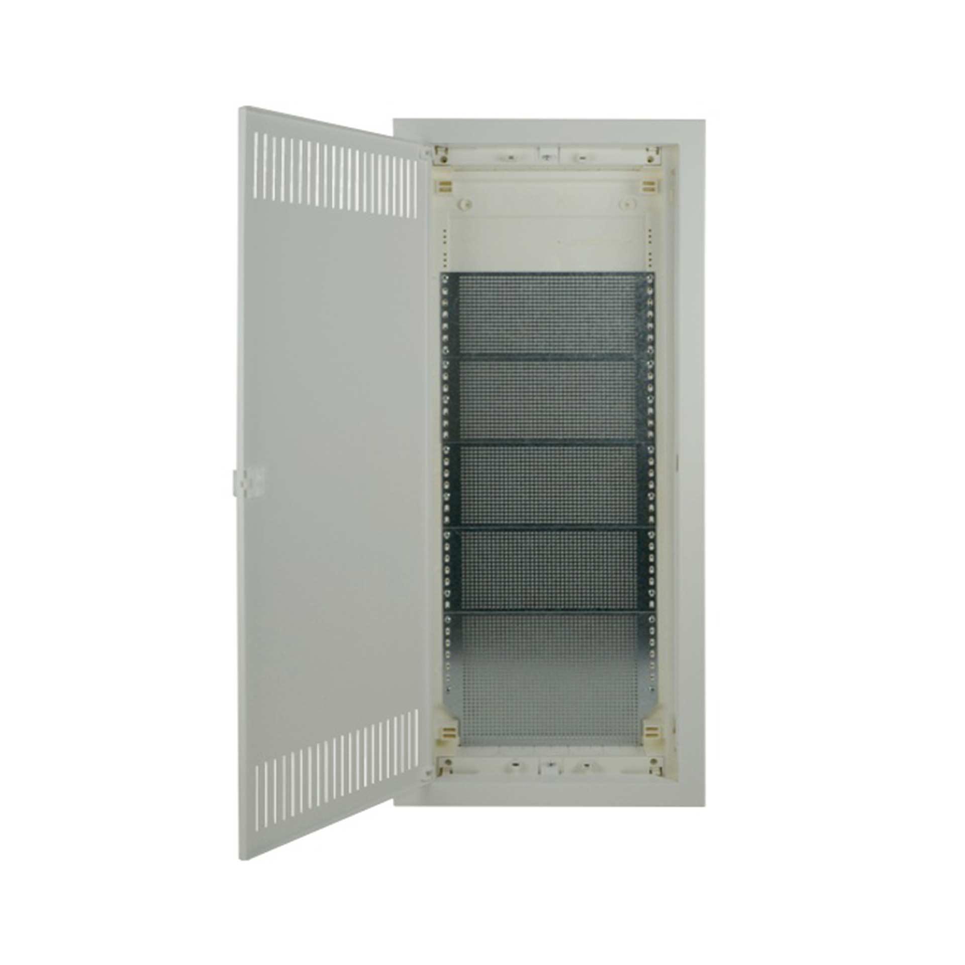 Distributore multimediale da incasso per l'installazione in pareti di ogni tipo, composto da parte inferiore (vassoio a parete) e parte superiore (telaio e porta), porta perforata in lamiera d'acciaio colore RAL 9003 (bianco segnale), vassoio a parete in plastica senza alogeni, incl. piastra per fori di montaggio, incl. kit di montaggio a parete in cavità, senza alogeni, cerniera della porta intercambiabile (cerniera sinistra o destra)