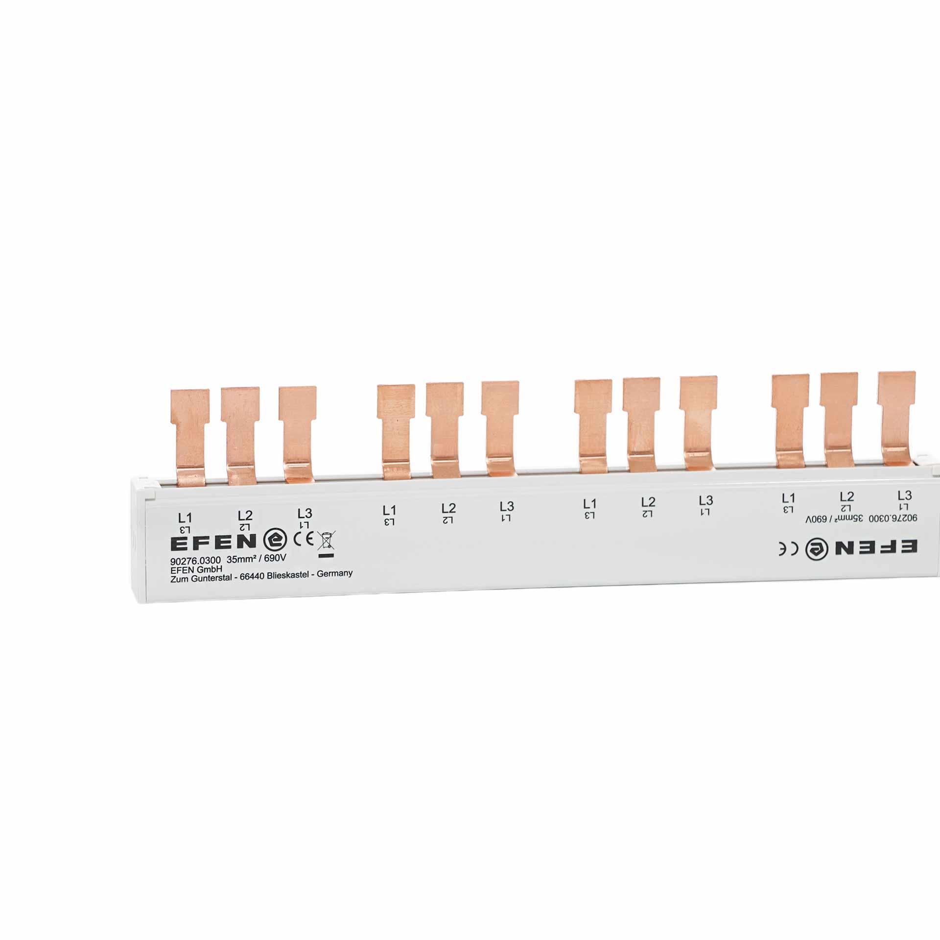 Pettine di alimentazione 35mm2 per 3x Silas/IN NH00. Corrente nominale per l'alimentazione all'estremità della sbarra di fase: Max. 200A. Corrente nominale per l'ingresso al centro della sbarra di fase: Max. 250A.