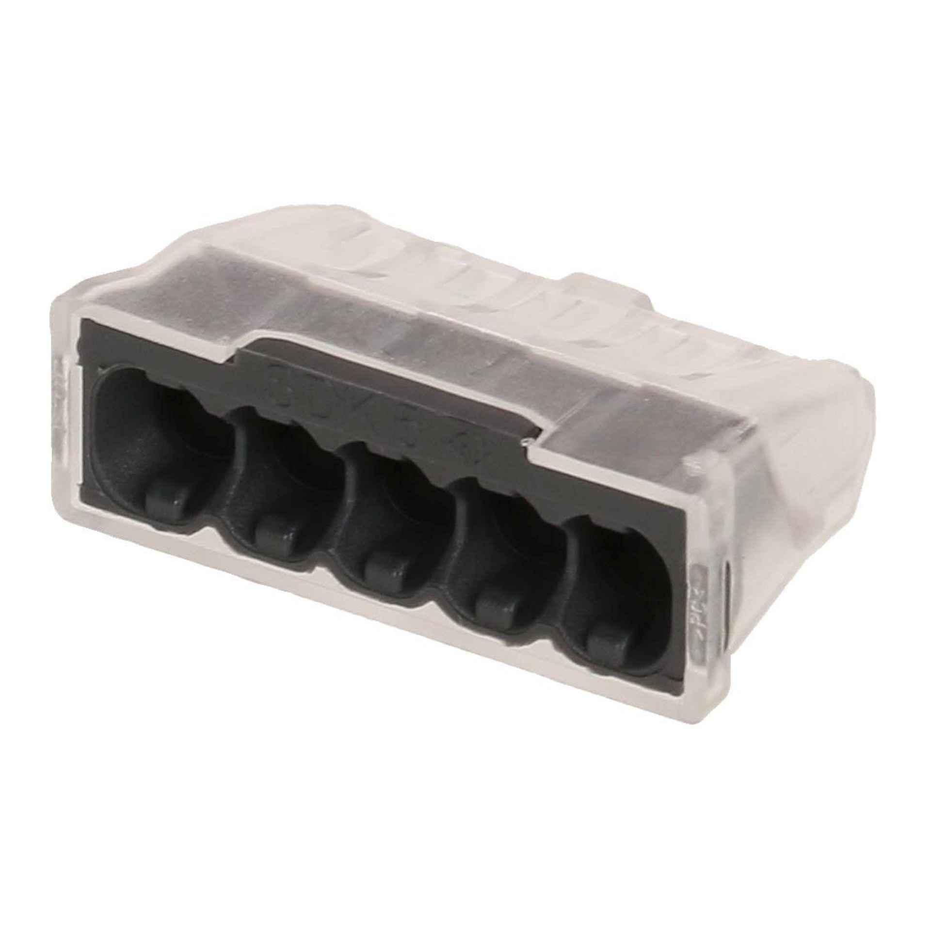 Morsetto a scatola senza viti a 5 poli, 0,5-2,5mm2 / Tensione: 450V / Ampere: 24A / per conduttori rigidi e a trefoli / Colore: trasparente/antracite